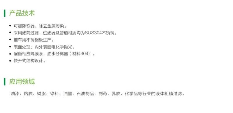 油漆、粘胶、树脂、染料、油墨、石油制品、制药、乳胶、化学品等行业的液体粗精过滤。